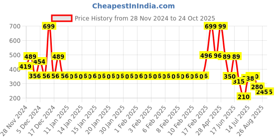 The current price is ₹245, which is ₹35 (16.7%) higher than the best price of ₹210 last seen on 24 Jun 2025. Over the 330 day price history period, prices have ranged from ₹210 to ₹699, with an average of ₹382. The pricing shows high volatility with significant fluctuations, and the overall trend is favorable for consumers as prices are getting cheaper. In terms of recent activity, there have been 0 price changes this week, 0 this month, and 51 over the past year. If you need this product now, it's a reasonable time to buy as prices are stable, but you might want to monitor for potential better deals.