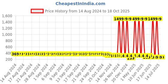 The current price is ₹269, which is ₹30 (12.6%) higher than the best price of ₹239 last seen on 1 Apr 2025. Over the 430 day price history period, prices have ranged from ₹239 to ₹1,499, with an average of ₹472. The pricing shows high volatility with significant fluctuations, and the overall trend is favorable for consumers as prices are getting cheaper. In terms of recent activity, there have been 0 price changes this week, 0 this month, and 29 over the past year. This is an excellent time to make a purchase as prices are trending downward and conditions appear favorable.