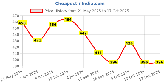 Good news! The current price of ₹396 is at its best ever level. Over the 148 day price history period, prices have ranged from ₹396 to ₹464, with an average of ₹428. The pricing shows moderate volatility, and the overall trend is favorable for consumers as prices are getting cheaper. In terms of recent activity, there have been 0 price changes this week, 2 this month, and 8 over the past year. If you need this product now, it's a reasonable time to buy as prices are stable, but you might want to monitor for potential better deals.