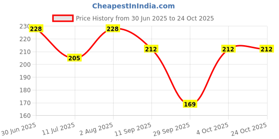 The current price is ₹212, which is ₹43 (25.4%) higher than the best price of ₹169 last seen on 29 Sep 2025. Over the 116 day price history period, prices have ranged from ₹169 to ₹228, with an average of ₹209. The pricing shows moderate volatility, and the overall trend is favorable for consumers as prices are getting cheaper. In terms of recent activity, there have been 0 price changes this week, 1 this month, and 5 over the past year. If you need this product now, it's a reasonable time to buy as prices are stable, but you might want to monitor for potential better deals.