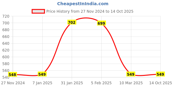 The current price is ₹549, which is ₹1 (0.2%) higher than the best price of ₹548 last seen on 27 Nov 2024. Over the 320 day price history period, prices have ranged from ₹548 to ₹702, with an average of ₹599. The pricing shows moderate volatility, with prices remaining relatively stable overall. In terms of recent activity, there have been 0 price changes this week, 0 this month, and 4 over the past year. The price direction is uncertain, so monitor the situation for a few more days before making a decision.