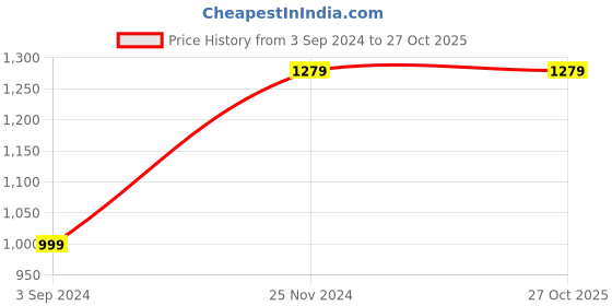 The current price is ₹1,279, which is ₹280 (28.0%) higher than the best price of ₹999 last seen on 3 Sep 2024. Over the 419 day price history period, prices have ranged from ₹999 to ₹1,279, with an average of ₹1,186. The pricing shows moderate volatility, but the overall trend is concerning as prices are getting more expensive. In terms of recent activity, there have been 0 price changes this week, 0 this month, and 0 over the past year. Consider waiting before making a purchase as prices are rising and better deals may be available later.