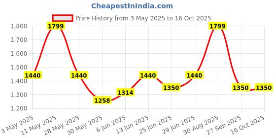 The current price is ₹1,350, which is ₹92 (7.3%) higher than the best price of ₹1,258 last seen on 30 May 2025. Over the 166 day price history period, prices have ranged from ₹1,258 to ₹1,799, with an average of ₹1,453. The pricing shows moderate volatility, and the overall trend is favorable for consumers as prices are getting cheaper. In terms of recent activity, there have been 0 price changes this week, 0 this month, and 9 over the past year. This is an excellent time to make a purchase as prices are trending downward and conditions appear favorable.