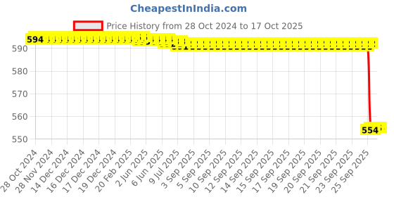 The current price is ₹555, which is ₹1 (0.2%) higher than the best price of ₹554 last seen on 25 Sep 2025. Over the 353 day price history period, prices have ranged from ₹554 to ₹595, with an average of ₹592. The pricing has been quite stable with low volatility, and the overall trend is favorable for consumers as prices are getting cheaper. In terms of recent activity, there have been 0 price changes this week, 28 this month, and 107 over the past year. If you need this product now, it's a reasonable time to buy as prices are stable, but you might want to monitor for potential better deals.