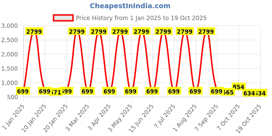 Fantastic! The current price of ₹634 is at its best ever level. Over the 290 day price history period, prices have ranged from ₹634 to ₹2,799, with an average of ₹1,428. The pricing shows high volatility with significant fluctuations, and the overall trend is favorable for consumers as prices are getting cheaper. In terms of recent activity, there have been 0 price changes this week, 2 this month, and 21 over the past year. This is an excellent time to make a purchase as prices are trending downward and conditions appear favorable.