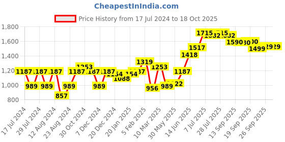 The current price is ₹1,529, which is ₹672 (78.4%) higher than the best price of ₹857 last seen on 22 Aug 2024. Over the 458 day price history period, prices have ranged from ₹857 to ₹1,715, with an average of ₹1,281. The pricing shows high volatility with significant fluctuations, but the overall trend is concerning as prices are getting more expensive. In terms of recent activity, there have been 0 price changes this week, 2 this month, and 25 over the past year. If you need this product now, it's a reasonable time to buy as prices are stable, but you might want to monitor for potential better deals.