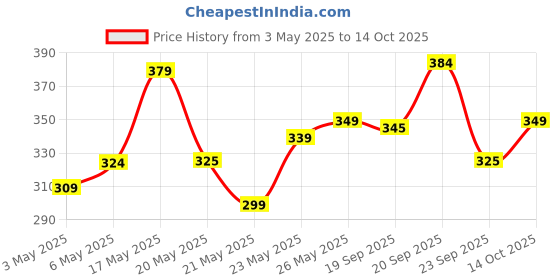 The current price is ₹349, which is ₹50 (16.7%) higher than the best price of ₹299 last seen on 21 May 2025. Over the 164 day price history period, prices have ranged from ₹299 to ₹384, with an average of ₹339. The pricing shows moderate volatility, but the overall trend is concerning as prices are getting more expensive. In terms of recent activity, there have been 0 price changes this week, 3 this month, and 10 over the past year. If you need this product now, it's a reasonable time to buy as prices are stable, but you might want to monitor for potential better deals.