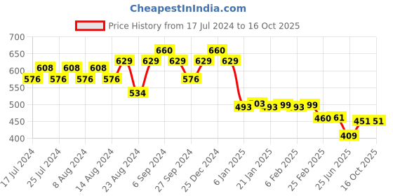 The current price is ₹451, which is ₹42 (10.3%) higher than the best price of ₹409 last seen on 25 Jun 2025. Over the 456 day price history period, prices have ranged from ₹409 to ₹660, with an average of ₹552. The pricing shows moderate volatility, and the overall trend is favorable for consumers as prices are getting cheaper. In terms of recent activity, there have been 0 price changes this week, 0 this month, and 12 over the past year. If you need this product now, it's a reasonable time to buy as prices are stable, but you might want to monitor for potential better deals.