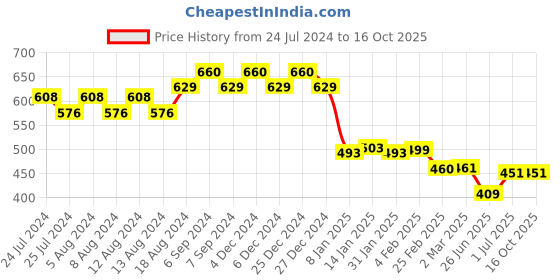 The current price is ₹451, which is ₹42 (10.3%) higher than the best price of ₹409 last seen on 26 Jun 2025. Over the 449 day price history period, prices have ranged from ₹409 to ₹660, with an average of ₹558. The pricing shows moderate volatility, and the overall trend is favorable for consumers as prices are getting cheaper. In terms of recent activity, there have been 0 price changes this week, 0 this month, and 11 over the past year. If you need this product now, it's a reasonable time to buy as prices are stable, but you might want to monitor for potential better deals.