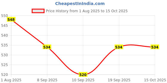 The current price is ₹534, which is ₹14 (2.7%) higher than the best price of ₹520 last seen on 10 Sep 2025. Over the 74 day price history period, prices have ranged from ₹520 to ₹548, with an average of ₹534. The pricing has been quite stable with low volatility, with prices remaining relatively stable overall. In terms of recent activity, there have been 0 price changes this week, 0 this month, and 3 over the past year. If you need this product now, it's a reasonable time to buy as prices are stable, but you might want to monitor for potential better deals.