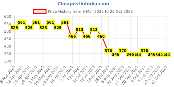 Exciting update! The current price of ₹344 is at its best ever level. Over the 227 day price history period, prices have ranged from ₹344 to ₹561, with an average of ₹452. The pricing shows high volatility with significant fluctuations, and the overall trend is favorable for consumers as prices are getting cheaper. In terms of recent activity, there have been 0 price changes this week, 2 this month, and 20 over the past year. If you need this product now, it's a reasonable time to buy as prices are stable, but you might want to monitor for potential better deals.