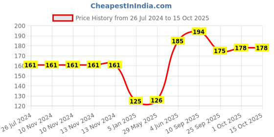 The current price is ₹178, which is ₹52.42 (41.7%) higher than the best price of ₹125.58 last seen on 5 Jan 2025. Over the 445 day price history period, prices have ranged from ₹125.58 to ₹194, with an average of ₹164. The pricing shows moderate volatility, but the overall trend is concerning as prices are getting more expensive. In terms of recent activity, there have been 0 price changes this week, 1 this month, and 9 over the past year. If you need this product now, it's a reasonable time to buy as prices are stable, but you might want to monitor for potential better deals.
