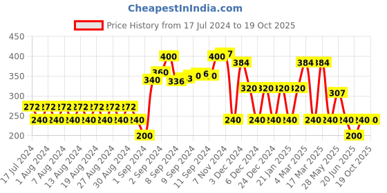 The current price is ₹240, which is ₹40 (20.0%) higher than the best price of ₹200 last seen on 1 Sep 2024. Over the 458 day price history period, prices have ranged from ₹200 to ₹407, with an average of ₹291. The pricing shows high volatility with significant fluctuations, and the overall trend is favorable for consumers as prices are getting cheaper. In terms of recent activity, there have been 0 price changes this week, 0 this month, and 17 over the past year. If you need this product now, it's a reasonable time to buy as prices are stable, but you might want to monitor for potential better deals.