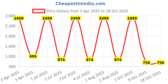 Exciting update! The current price of ₹756 is at its best ever level. Over the 198 day price history period, prices have ranged from ₹756 to ₹2,499, with an average of ₹1,603. The pricing shows high volatility with significant fluctuations, and the overall trend is favorable for consumers as prices are getting cheaper. In terms of recent activity, there have been 0 price changes this week, 1 this month, and 9 over the past year. This is an excellent time to make a purchase as prices are trending downward and conditions appear favorable.