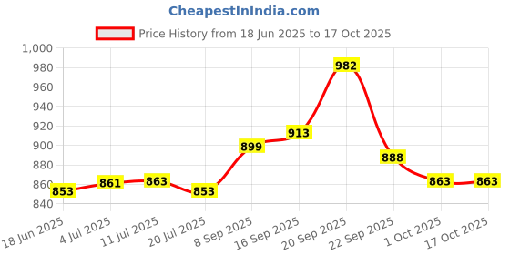 The current price is ₹863, which is ₹10 (1.2%) higher than the best price of ₹853 last seen on 18 Jun 2025. Over the 120 day price history period, prices have ranged from ₹853 to ₹982, with an average of ₹884. The pricing has been quite stable with low volatility, with prices remaining relatively stable overall. In terms of recent activity, there have been 0 price changes this week, 2 this month, and 8 over the past year. If you need this product now, it's a reasonable time to buy as prices are stable, but you might want to monitor for potential better deals.