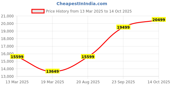 The current price is ₹20,499, which is ₹6,850 (50.2%) higher than the best price of ₹13,649 last seen on 19 Mar 2025. Over the 215 day price history period, prices have ranged from ₹13,649 to ₹20,499, with an average of ₹16,969. The pricing shows high volatility with significant fluctuations, but the overall trend is concerning as prices are getting more expensive. In terms of recent activity, there have been 0 price changes this week, 1 this month, and 4 over the past year. Consider waiting before making a purchase as prices are rising and better deals may be available later.