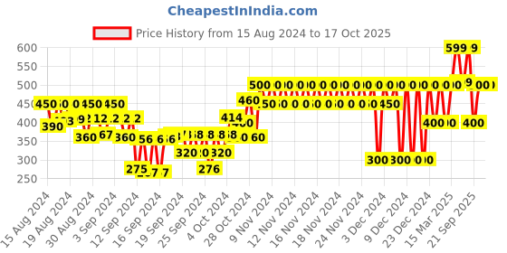 The current price is ₹500, which is ₹233 (87.3%) higher than the best price of ₹267 last seen on 14 Sep 2024. Over the 427 day price history period, prices have ranged from ₹267 to ₹599, with an average of ₹422. The pricing shows high volatility with significant fluctuations, but the overall trend is concerning as prices are getting more expensive. In terms of recent activity, there have been 0 price changes this week, 1 this month, and 43 over the past year. If you need this product now, it's a reasonable time to buy as prices are stable, but you might want to monitor for potential better deals.