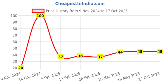 The current price is ₹45, which is ₹25 (125.0%) higher than the best price of ₹20 last seen on 9 Nov 2024. Over the 341 day price history period, prices have ranged from ₹20 to ₹100, with an average of ₹46. The pricing shows high volatility with significant fluctuations, but the overall trend is concerning as prices are getting more expensive. In terms of recent activity, there have been 0 price changes this week, 0 this month, and 6 over the past year. If you need this product now, it's a reasonable time to buy as prices are stable, but you might want to monitor for potential better deals.