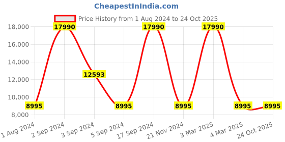 Fantastic! The current price of ₹8,995 is at its best ever level. Over the 449 day price history period, prices have ranged from ₹8,995 to ₹17,990, with an average of ₹12,393. The pricing shows high volatility with significant fluctuations, with prices remaining relatively stable overall. In terms of recent activity, there have been 0 price changes this week, 0 this month, and 2 over the past year. The price direction is uncertain, so monitor the situation for a few more days before making a decision.