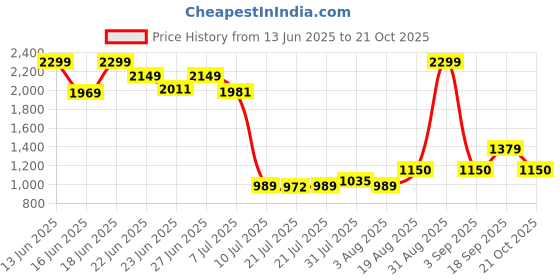 The current price is ₹1,150, which is ₹178 (18.3%) higher than the best price of ₹972 last seen on 21 Jul 2025. Over the 130 day price history period, prices have ranged from ₹972 to ₹2,299, with an average of ₹1,586. The pricing shows high volatility with significant fluctuations, and the overall trend is favorable for consumers as prices are getting cheaper. In terms of recent activity, there have been 0 price changes this week, 0 this month, and 16 over the past year. If you need this product now, it's a reasonable time to buy as prices are stable, but you might want to monitor for potential better deals.