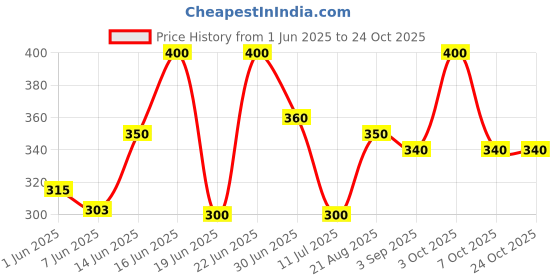 The current price is ₹340, which is ₹40 (13.3%) higher than the best price of ₹300 last seen on 19 Jun 2025. Over the 145 day price history period, prices have ranged from ₹300 to ₹400, with an average of ₹346. The pricing shows moderate volatility, but the overall trend is concerning as prices are getting more expensive. In terms of recent activity, there have been 0 price changes this week, 1 this month, and 11 over the past year. If you need this product now, it's a reasonable time to buy as prices are stable, but you might want to monitor for potential better deals.
