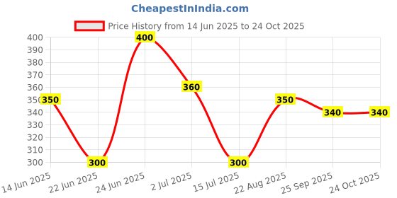 The current price is ₹340, which is ₹40 (13.3%) higher than the best price of ₹300 last seen on 22 Jun 2025. Over the 132 day price history period, prices have ranged from ₹300 to ₹400, with an average of ₹343. The pricing shows moderate volatility, with prices remaining relatively stable overall. In terms of recent activity, there have been 0 price changes this week, 0 this month, and 6 over the past year. If you need this product now, it's a reasonable time to buy as prices are stable, but you might want to monitor for potential better deals.