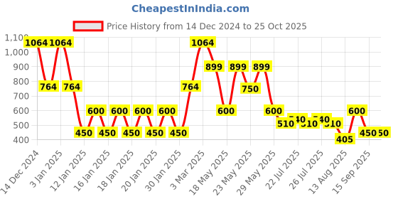 The current price is ₹450, which is ₹45 (11.1%) higher than the best price of ₹405 last seen on 13 Aug 2025. Over the 314 day price history period, prices have ranged from ₹405 to ₹1,064, with an average of ₹643. The pricing shows high volatility with significant fluctuations, and the overall trend is favorable for consumers as prices are getting cheaper. In terms of recent activity, there have been 0 price changes this week, 0 this month, and 28 over the past year. This is an excellent time to make a purchase as prices are trending downward and conditions appear favorable.