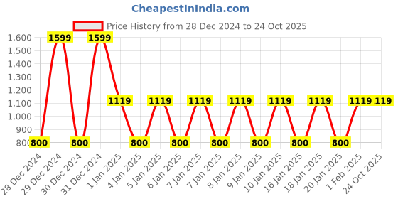 The current price is ₹1,119, which is ₹319 (39.9%) higher than the best price of ₹800 last seen on 28 Dec 2024. Over the 300 day price history period, prices have ranged from ₹800 to ₹1,599, with an average of ₹1,031. The pricing shows high volatility with significant fluctuations, but the overall trend is concerning as prices are getting more expensive. In terms of recent activity, there have been 0 price changes this week, 0 this month, and 16 over the past year. Consider waiting before making a purchase as prices are rising and better deals may be available later.
