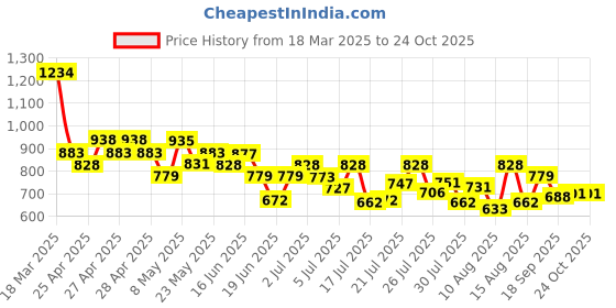 The current price is ₹701, which is ₹68 (10.7%) higher than the best price of ₹633 last seen on 10 Aug 2025. Over the 220 day price history period, prices have ranged from ₹633 to ₹1,234, with an average of ₹796. The pricing shows moderate volatility, and the overall trend is favorable for consumers as prices are getting cheaper. In terms of recent activity, there have been 0 price changes this week, 0 this month, and 33 over the past year. If you need this product now, it's a reasonable time to buy as prices are stable, but you might want to monitor for potential better deals.
