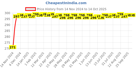The current price is ₹298, which is ₹27 (10.0%) higher than the best price of ₹271 last seen on 14 Nov 2024. Over the 333 day price history period, prices have ranged from ₹271 to ₹299, with an average of ₹297. The pricing has been quite stable with low volatility, but the overall trend is concerning as prices are getting more expensive. In terms of recent activity, there have been 0 price changes this week, 0 this month, and 30 over the past year. If you need this product now, it's a reasonable time to buy as prices are stable, but you might want to monitor for potential better deals.