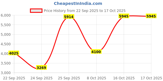 The current price is ₹5,945, which is ₹2,675.28 (81.8%) higher than the best price of ₹3,269.72 last seen on 24 Sep 2025. Over the 24 day price history period, prices have ranged from ₹3,269.72 to ₹5,945, with an average of ₹4,866. The pricing shows high volatility with significant fluctuations, but the overall trend is concerning as prices are getting more expensive. In terms of recent activity, there have been 0 price changes this week, 4 this month, and 4 over the past year. Consider waiting before making a purchase as prices are rising and better deals may be available later.