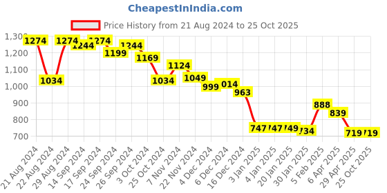 Fantastic! The current price of ₹719 is at its best ever level. Over the 429 day price history period, prices have ranged from ₹719 to ₹1,274, with an average of ₹1,002. The pricing shows high volatility with significant fluctuations, and the overall trend is favorable for consumers as prices are getting cheaper. In terms of recent activity, there have been 0 price changes this week, 0 this month, and 12 over the past year. This is an excellent time to make a purchase as prices are trending downward and conditions appear favorable.