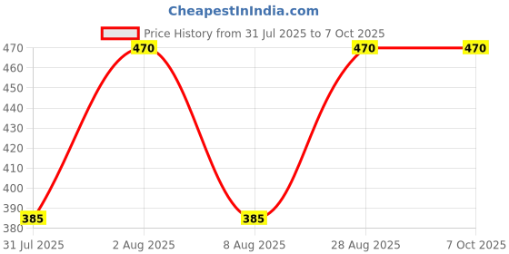 The current price is ₹470, which is ₹85 (22.1%) higher than the best price of ₹385 last seen on 31 Jul 2025. Over the 67 day price history period, prices have ranged from ₹385 to ₹470, with an average of ₹436. The pricing shows moderate volatility, but the overall trend is concerning as prices are getting more expensive. In terms of recent activity, there have been 0 price changes this week, 0 this month, and 3 over the past year. If you need this product now, it's a reasonable time to buy as prices are stable, but you might want to monitor for potential better deals.