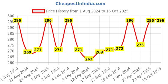 The current price is ₹296, which is ₹33 (12.5%) higher than the best price of ₹263 last seen on 13 Sep 2024. Over the 440 day price history period, prices have ranged from ₹263 to ₹296, with an average of ₹281. The pricing has been quite stable with low volatility, with prices remaining relatively stable overall. In terms of recent activity, there have been 0 price changes this week, 0 this month, and 2 over the past year. If you need this product now, it's a reasonable time to buy as prices are stable, but you might want to monitor for potential better deals.