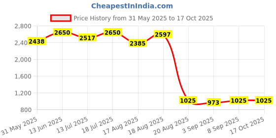 The current price is ₹1,025, which is ₹52 (5.3%) higher than the best price of ₹973 last seen on 3 Sep 2025. Over the 138 day price history period, prices have ranged from ₹973 to ₹2,650, with an average of ₹1,929. The pricing shows high volatility with significant fluctuations, and the overall trend is favorable for consumers as prices are getting cheaper. In terms of recent activity, there have been 0 price changes this week, 0 this month, and 8 over the past year. If you need this product now, it's a reasonable time to buy as prices are stable, but you might want to monitor for potential better deals.