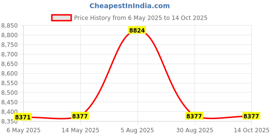 The current price is ₹8,377, which is ₹6 (0.1%) higher than the best price of ₹8,371 last seen on 6 May 2025. Over the 160 day price history period, prices have ranged from ₹8,371 to ₹8,824, with an average of ₹8,465. The pricing has been quite stable with low volatility, with prices remaining relatively stable overall. In terms of recent activity, there have been 0 price changes this week, 0 this month, and 3 over the past year. The price direction is uncertain, so monitor the situation for a few more days before making a decision.