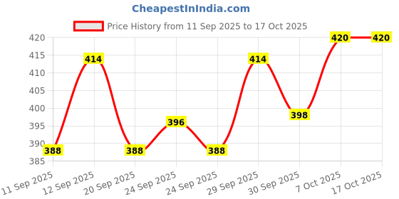 The current price is ₹420, which is ₹32 (8.2%) higher than the best price of ₹388 last seen on 11 Sep 2025. Over the 35 day price history period, prices have ranged from ₹388 to ₹420, with an average of ₹403. The pricing has been quite stable with low volatility, but the overall trend is concerning as prices are getting more expensive. In terms of recent activity, there have been 0 price changes this week, 5 this month, and 7 over the past year. If you need this product now, it's a reasonable time to buy as prices are stable, but you might want to monitor for potential better deals.