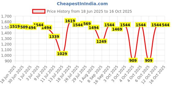 The current price is ₹1,544, which is ₹635 (69.9%) higher than the best price of ₹909 last seen on 4 Oct 2025. Over the 120 day price history period, prices have ranged from ₹909 to ₹1,619, with an average of ₹1,421. The pricing shows high volatility with significant fluctuations, with prices remaining relatively stable overall. In terms of recent activity, there have been 0 price changes this week, 5 this month, and 18 over the past year. The price direction is uncertain, so monitor the situation for a few more days before making a decision.