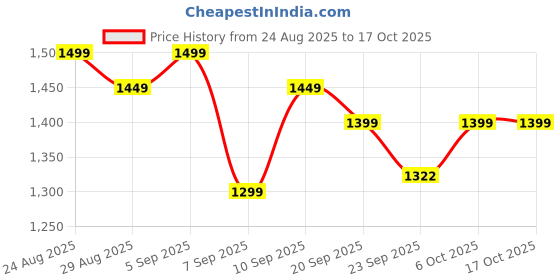 The current price is ₹1,399, which is ₹100 (7.7%) higher than the best price of ₹1,299 last seen on 7 Sep 2025. Over the 53 day price history period, prices have ranged from ₹1,299 to ₹1,499, with an average of ₹1,413. The pricing has been quite stable with low volatility, and the overall trend is favorable for consumers as prices are getting cheaper. In terms of recent activity, there have been 0 price changes this week, 2 this month, and 7 over the past year. If you need this product now, it's a reasonable time to buy as prices are stable, but you might want to monitor for potential better deals.