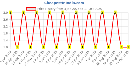 The current price is ₹1.55, which is ₹0.45 (40.9%) higher than the best price of ₹1.1 last seen on 26 Apr 2025. Over the 286 day price history period, prices have ranged from ₹1.1 to ₹3, with an average of ₹2. The pricing shows high volatility with significant fluctuations, and the overall trend is favorable for consumers as prices are getting cheaper. In terms of recent activity, there have been 0 price changes this week, 2 this month, and 17 over the past year. If you need this product now, it's a reasonable time to buy as prices are stable, but you might want to monitor for potential better deals.