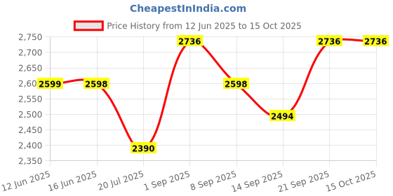 The current price is ₹2,736, which is ₹346 (14.5%) higher than the best price of ₹2,390 last seen on 20 Jul 2025. Over the 124 day price history period, prices have ranged from ₹2,390 to ₹2,736, with an average of ₹2,611. The pricing has been quite stable with low volatility, but the overall trend is concerning as prices are getting more expensive. In terms of recent activity, there have been 0 price changes this week, 0 this month, and 6 over the past year. Consider waiting before making a purchase as prices are rising and better deals may be available later.