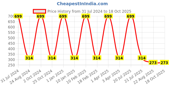 Fantastic! The current price of ₹273 is at its best ever level. Over the 444 day price history period, prices have ranged from ₹273 to ₹699, with an average of ₹473. The pricing shows high volatility with significant fluctuations, and the overall trend is favorable for consumers as prices are getting cheaper. In terms of recent activity, there have been 0 price changes this week, 0 this month, and 9 over the past year. If you need this product now, it's a reasonable time to buy as prices are stable, but you might want to monitor for potential better deals.