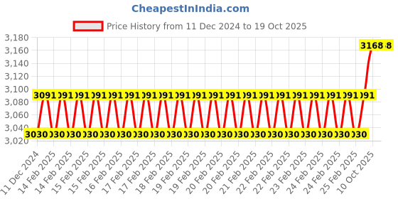 The current price is ₹3,168, which is ₹138 (4.6%) higher than the best price of ₹3,030 last seen on 11 Dec 2024. Over the 311 day price history period, prices have ranged from ₹3,030 to ₹3,168, with an average of ₹3,066. The pricing has been quite stable with low volatility, with prices remaining relatively stable overall. In terms of recent activity, there have been 0 price changes this week, 0 this month, and 40 over the past year. If you need this product now, it's a reasonable time to buy as prices are stable, but you might want to monitor for potential better deals.