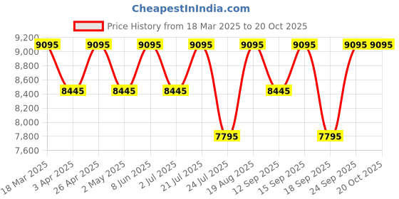 The current price is ₹9,095, which is ₹1,300 (16.7%) higher than the best price of ₹7,795 last seen on 24 Jul 2025. Over the 214 day price history period, prices have ranged from ₹7,795 to ₹9,095, with an average of ₹8,724. The pricing shows moderate volatility, with prices remaining relatively stable overall. In terms of recent activity, there have been 0 price changes this week, 0 this month, and 12 over the past year. The price direction is uncertain, so monitor the situation for a few more days before making a decision.
