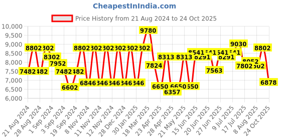 The current price is ₹6,878, which is ₹521 (8.2%) higher than the best price of ₹6,357 last seen on 28 Apr 2025. Over the 429 day price history period, prices have ranged from ₹6,357 to ₹9,780, with an average of ₹7,918. The pricing shows moderate volatility, and the overall trend is favorable for consumers as prices are getting cheaper. In terms of recent activity, there have been 0 price changes this week, 0 this month, and 31 over the past year. This is an excellent time to make a purchase as prices are trending downward and conditions appear favorable.