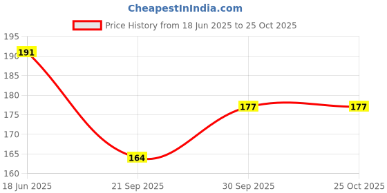The current price is ₹177, which is ₹13 (7.9%) higher than the best price of ₹164 last seen on 21 Sep 2025. Over the 128 day price history period, prices have ranged from ₹164 to ₹191, with an average of ₹177. The pricing shows moderate volatility, and the overall trend is favorable for consumers as prices are getting cheaper. In terms of recent activity, there have been 0 price changes this week, 0 this month, and 2 over the past year. If you need this product now, it's a reasonable time to buy as prices are stable, but you might want to monitor for potential better deals.