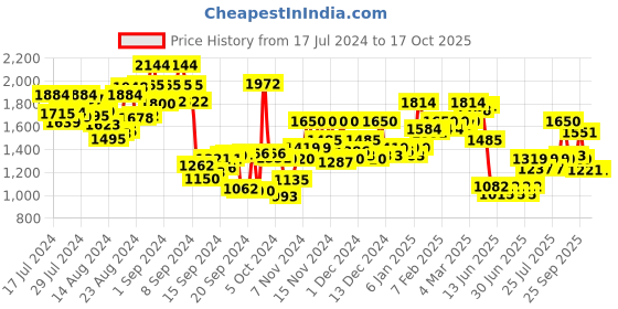 The current price is ₹1,221, which is ₹228 (23.0%) higher than the best price of ₹993 last seen on 25 Oct 2024. Over the 456 day price history period, prices have ranged from ₹993 to ₹2,144, with an average of ₹1,493. The pricing shows high volatility with significant fluctuations, and the overall trend is favorable for consumers as prices are getting cheaper. In terms of recent activity, there have been 0 price changes this week, 1 this month, and 55 over the past year. This is an excellent time to make a purchase as prices are trending downward and conditions appear favorable.