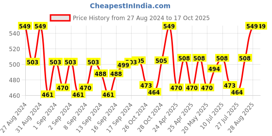 The current price is ₹549, which is ₹88 (19.1%) higher than the best price of ₹461 last seen on 31 Aug 2024. Over the 415 day price history period, prices have ranged from ₹461 to ₹549, with an average of ₹496. The pricing shows moderate volatility, with prices remaining relatively stable overall. In terms of recent activity, there have been 0 price changes this week, 0 this month, and 14 over the past year. If you need this product now, it's a reasonable time to buy as prices are stable, but you might want to monitor for potential better deals.
