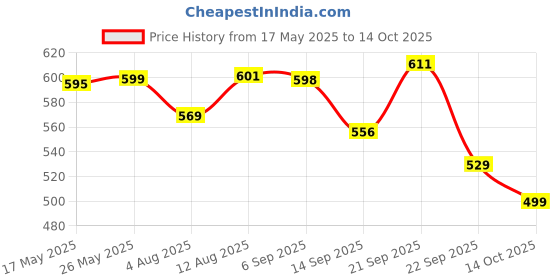 Awesome! The current price of ₹499 is at its best ever level. Over the 150 day price history period, prices have ranged from ₹499 to ₹611, with an average of ₹573. The pricing shows moderate volatility, and the overall trend is favorable for consumers as prices are getting cheaper. In terms of recent activity, there have been 0 price changes this week, 2 this month, and 8 over the past year. This is an excellent time to make a purchase as prices are trending downward and conditions appear favorable.