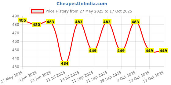 The current price is ₹449, which is ₹15 (3.5%) higher than the best price of ₹434 last seen on 11 Jul 2025. Over the 142 day price history period, prices have ranged from ₹434 to ₹485, with an average of ₹466. The pricing has been quite stable with low volatility, and the overall trend is favorable for consumers as prices are getting cheaper. In terms of recent activity, there have been 0 price changes this week, 3 this month, and 9 over the past year. If you need this product now, it's a reasonable time to buy as prices are stable, but you might want to monitor for potential better deals.